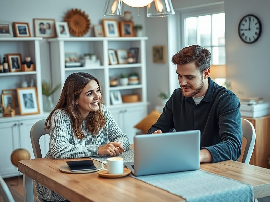 На изображении двое людей общаются за столом, работая на ноутбуке в уютной обстановке.